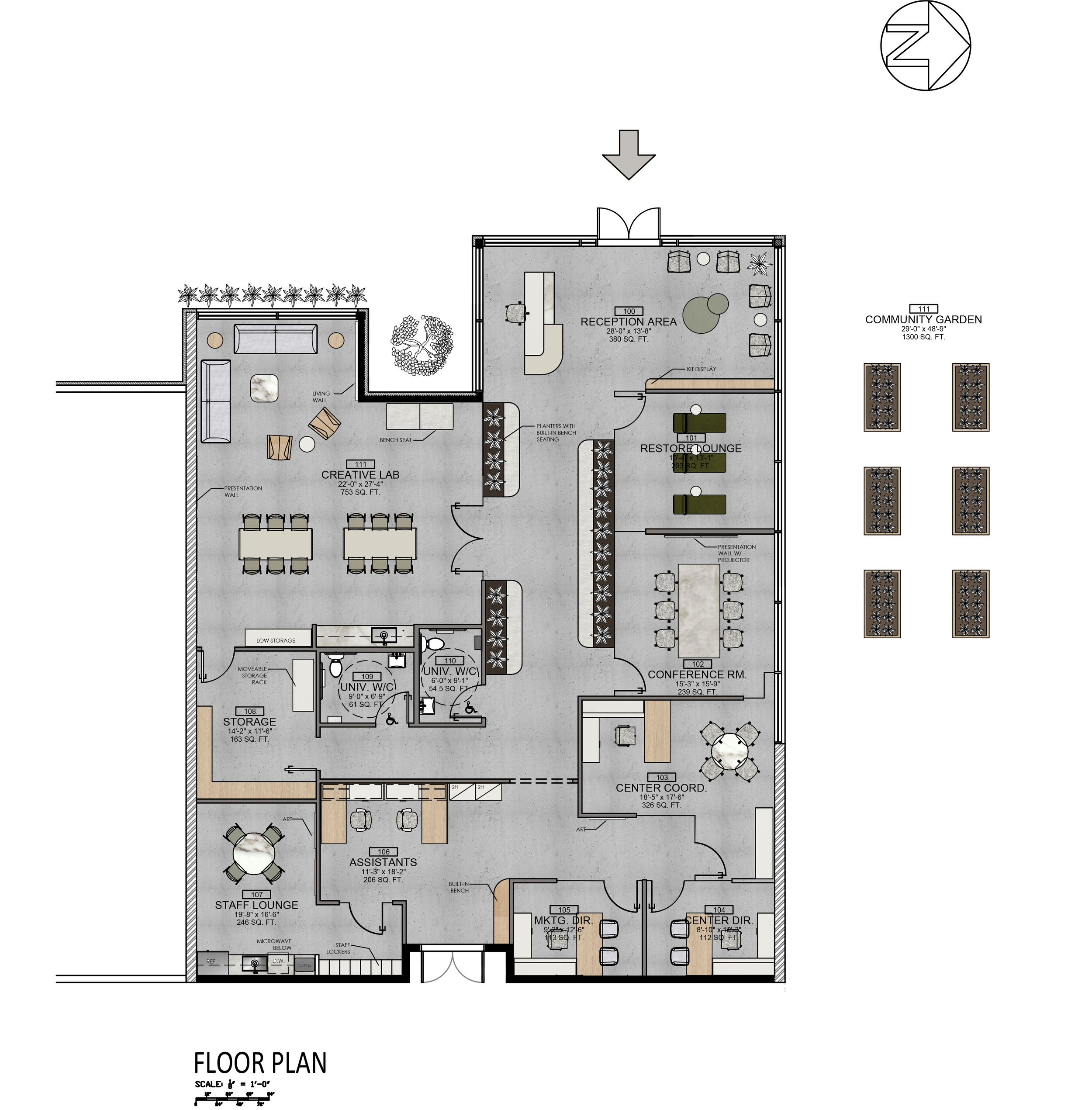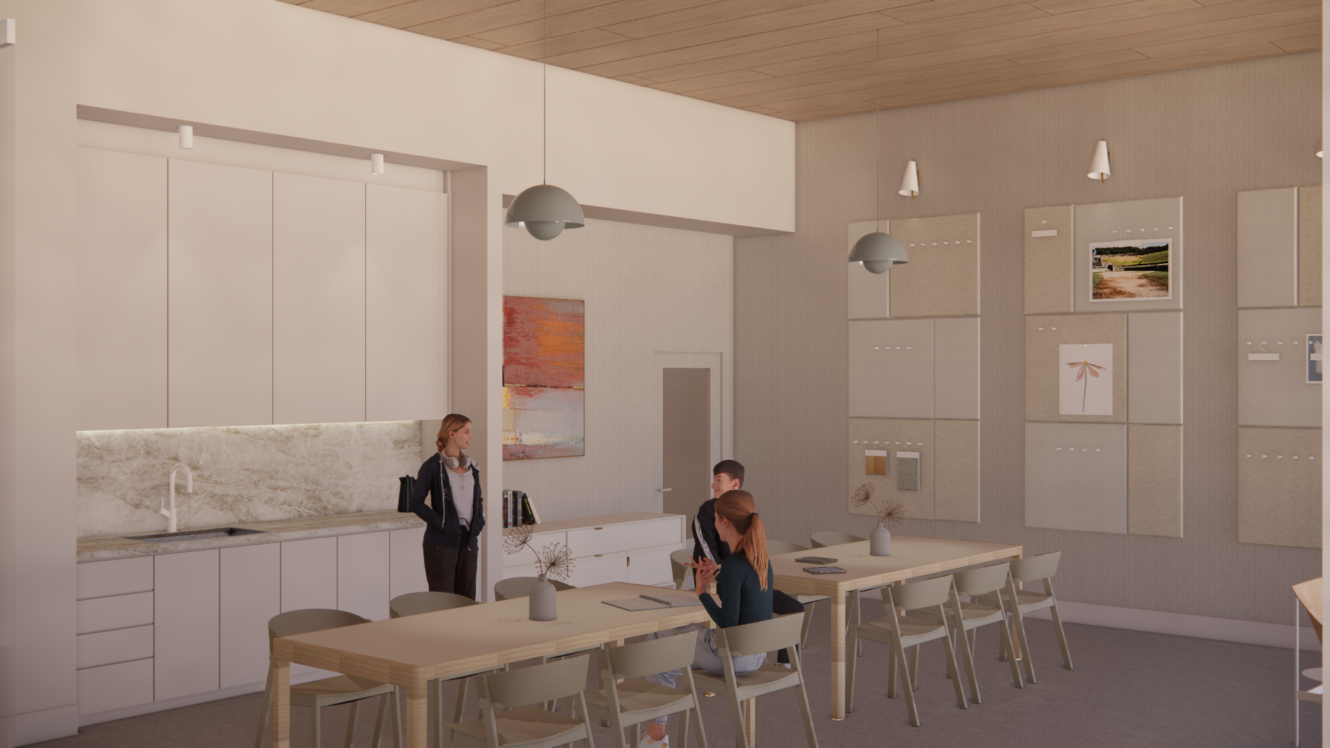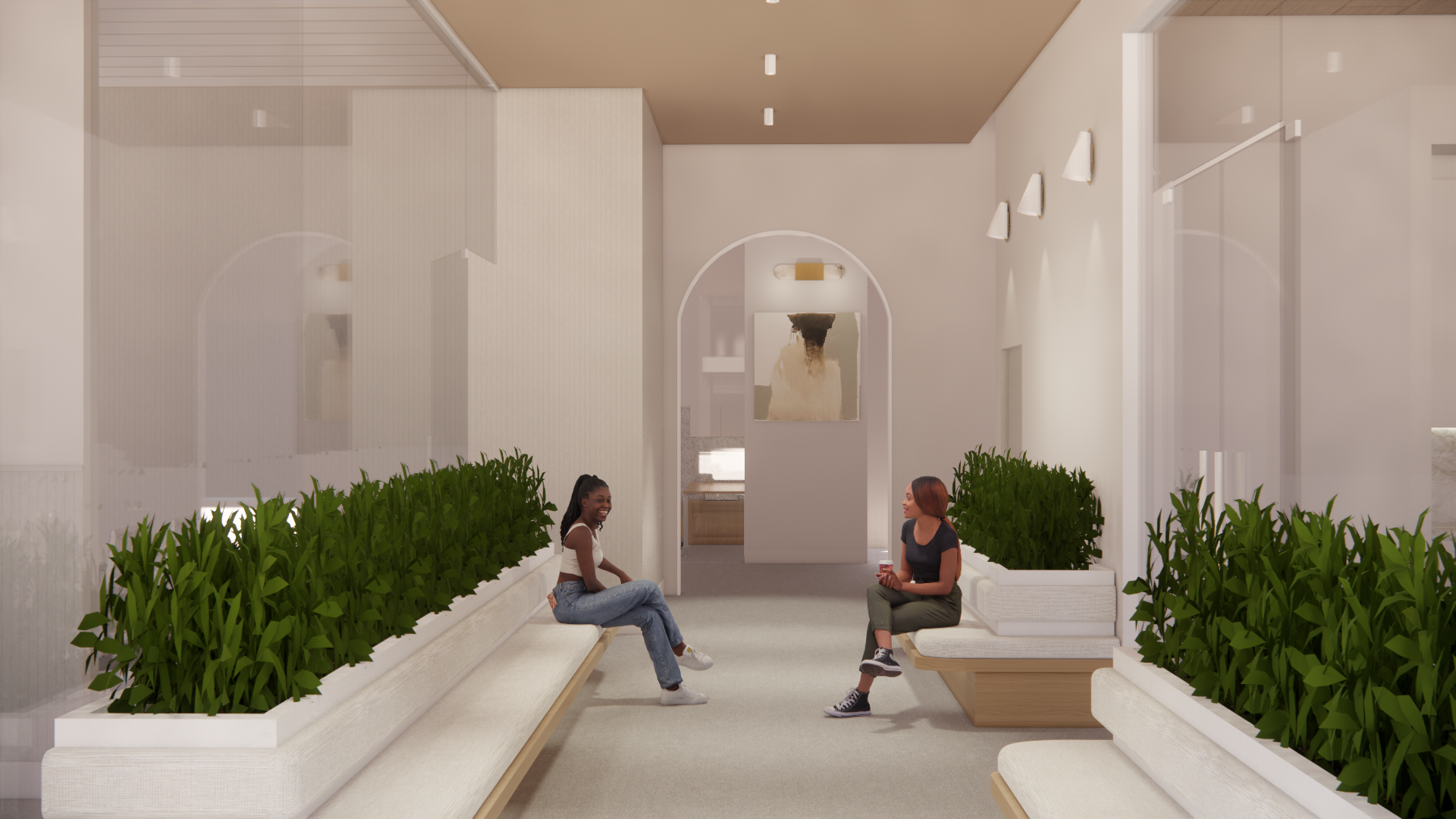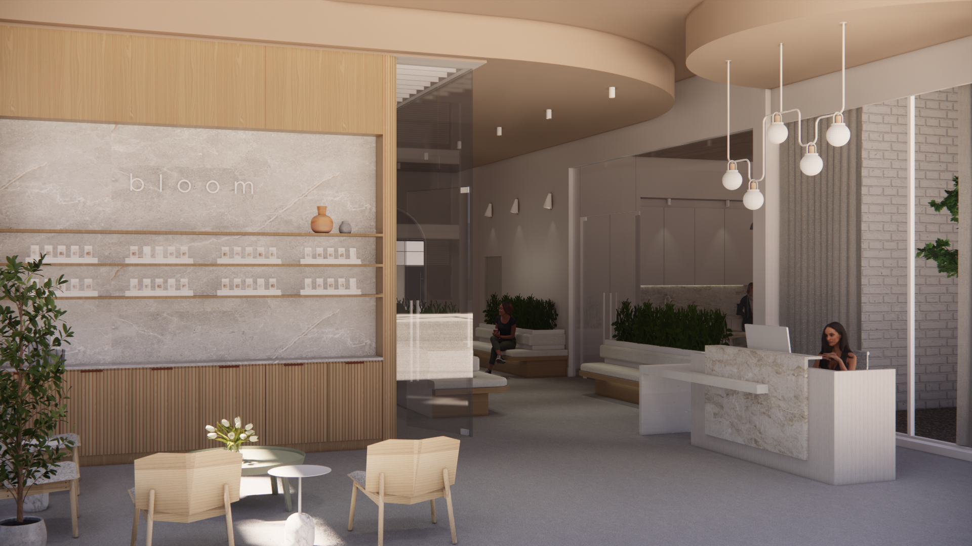 In the way that plants blossom and rise upwards, a combination of soft and vertical lines guide the eyes upward. Natural light is layered with warm, diffused lighting to create a comforting and inviting atmosphere. Earthy hues drawn from a springtime landscape are consistent throughout, offering a feeling of tranquility and stability. Biophilic elements are repeated throughout the space to foster a strong connection to nature, community and future possibilities.