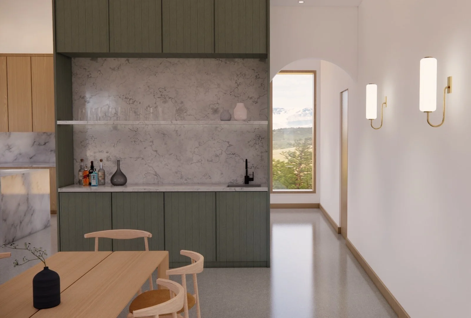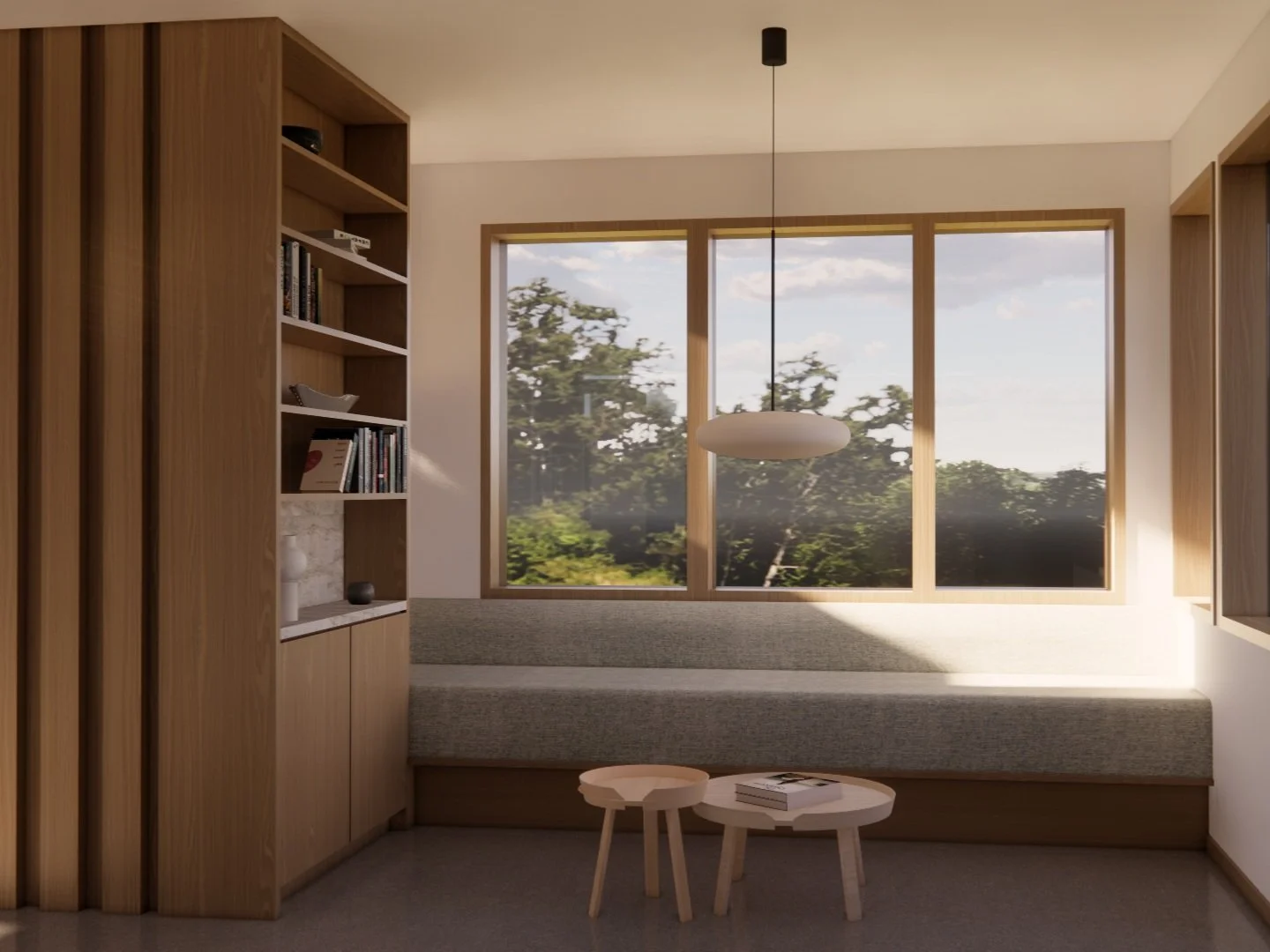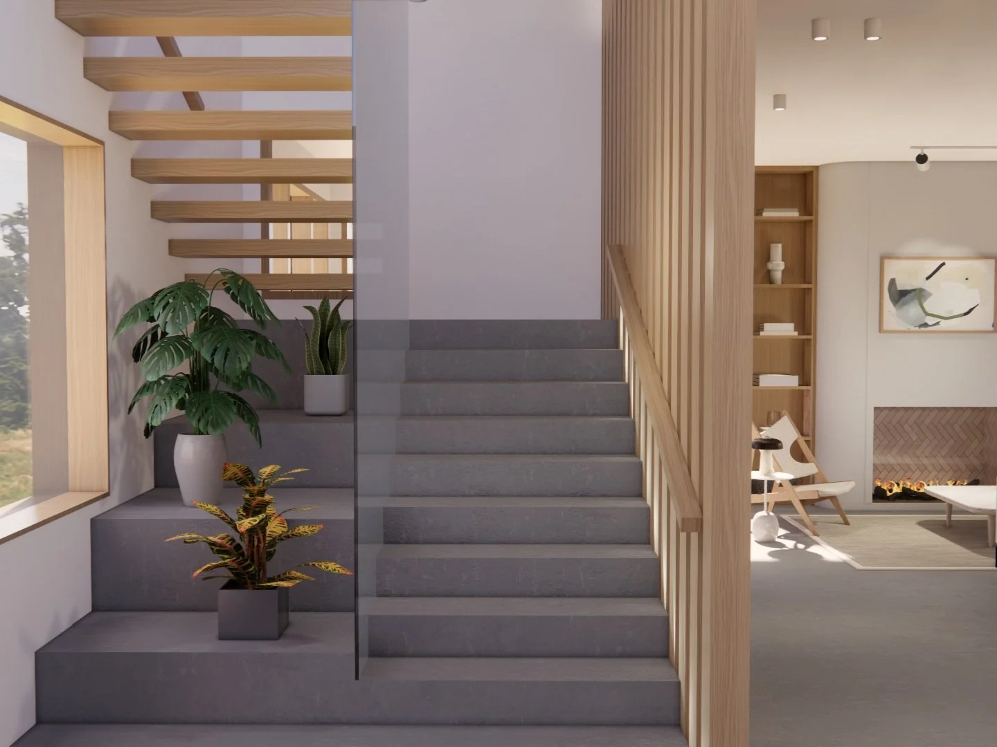 With a strong emphasis on entertaining, an open floor plan allows for interaction between the kitchen, dining area and living area. Natural light enters the space from all sides, reflecting on polished concrete and stone surfaces. Features of the home include a cozy reading nook, a central bar, and a staircase that doubles as a planter display.
