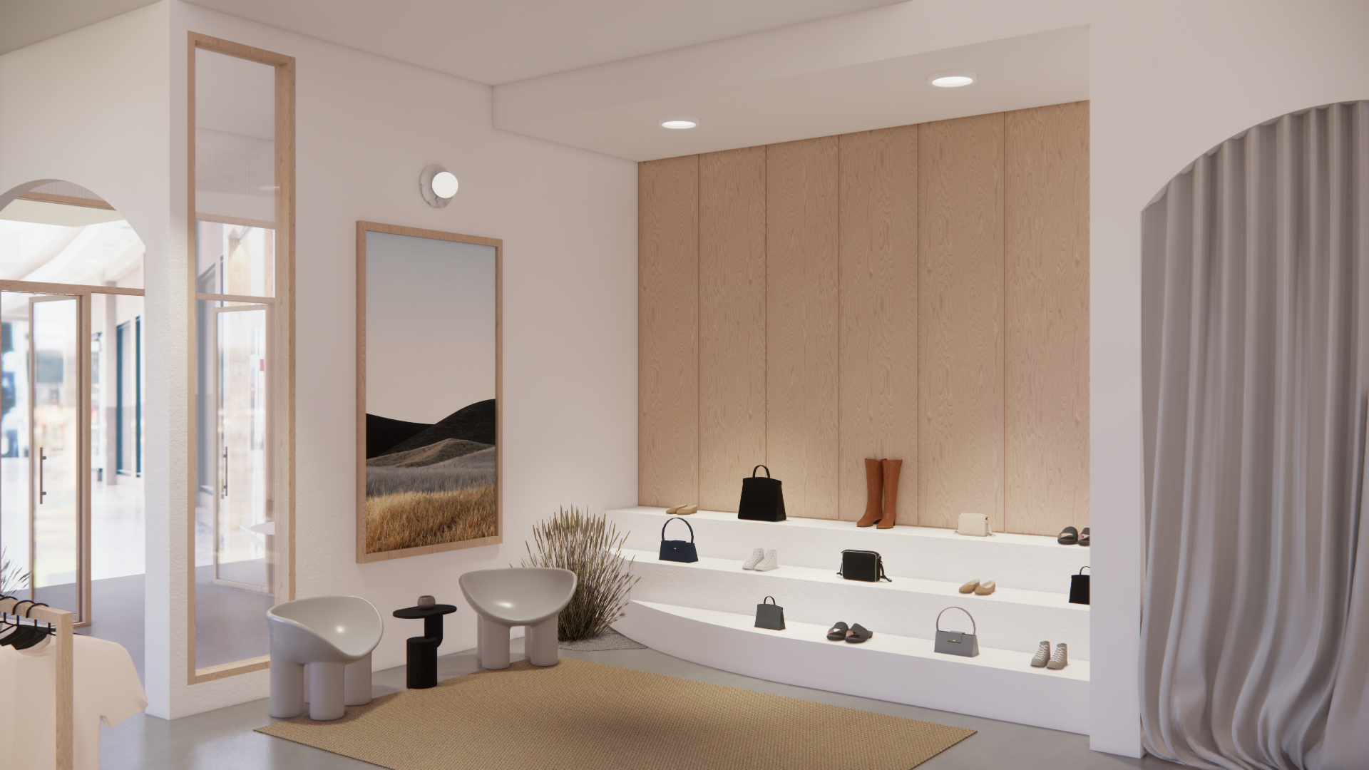 This space evokes minimalism and elegance, with earthy elements scattered throughout. With limited natural light entering the space, artificial light is layered in a way that achieves a soft and welcoming environment. A substantial wooden cash desk is grounded by a suspended floral installation for an impactful focal point. Smooth stone fixtures are symmetrically placed around the shop to accommodate high circulation areas and effective merchandising moments.