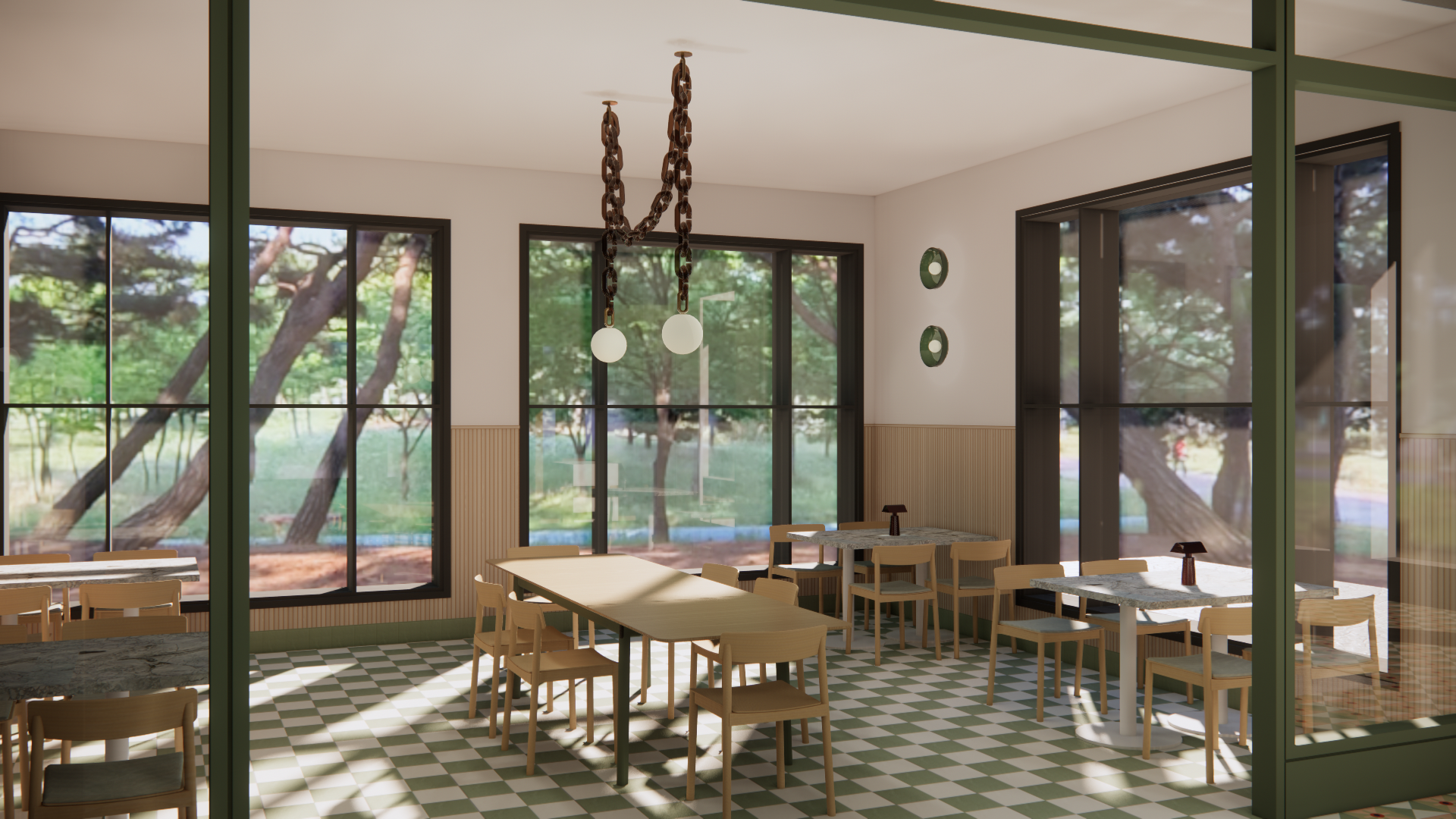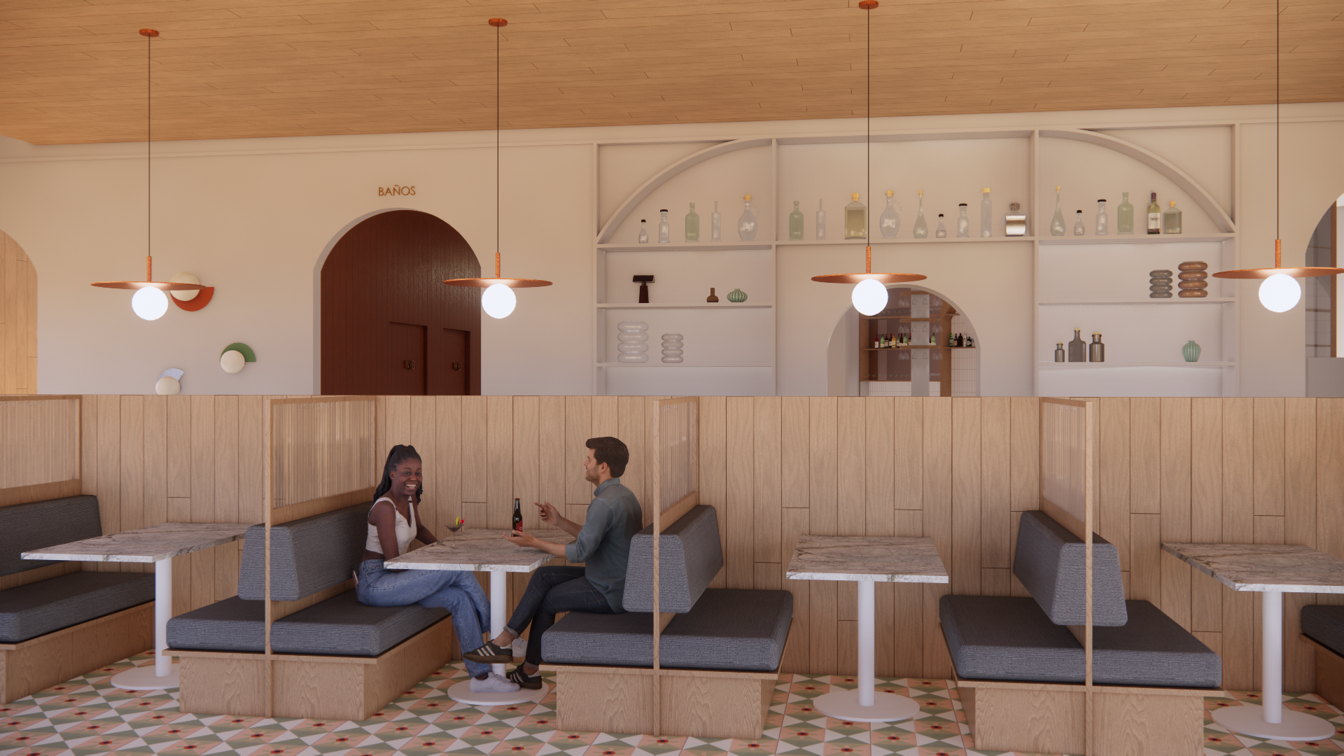The space features plastered walls, wood paneling, and arched openings. Playful floor tiles are consistent throughout the restaurant, with different patterns defining the main spaces. Existing full-height windows allow light to pool into the space for an airy feel. A balanced, comfortable and casual atmosphere will invite friends and families to reunite and stay for a while.